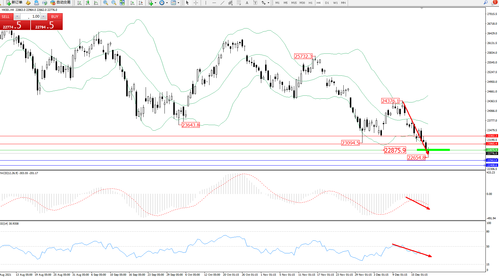 技术点评:空头动力延续布林带指标下轨附近持续震荡下行,低位抵达22654位置后有继续下行态势,短期下行趋势未见止步迹象,布林带指标呈张口走势良好,MACD指标处于空头区域维持震荡下行中,RSI指标处于空头区域持续向下移动;