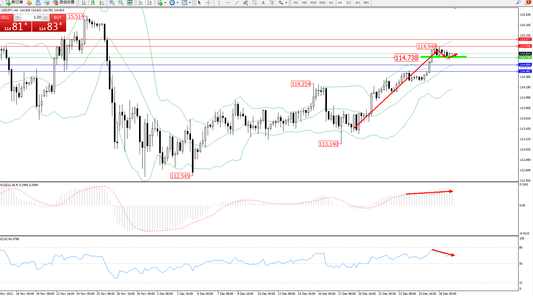 技术点评:多头动力延续布林带指标中上轨区间持续震荡上扬,高位抵达114.948附近节点遇阻整理,短期多头动力开始徘徊,但依旧上扬态势良好,布林带指标呈上扬趋势走势良好,MACD指标处于多头区域维持整理平移中,RSI指标处于多头区域上移后缓慢徘徊;