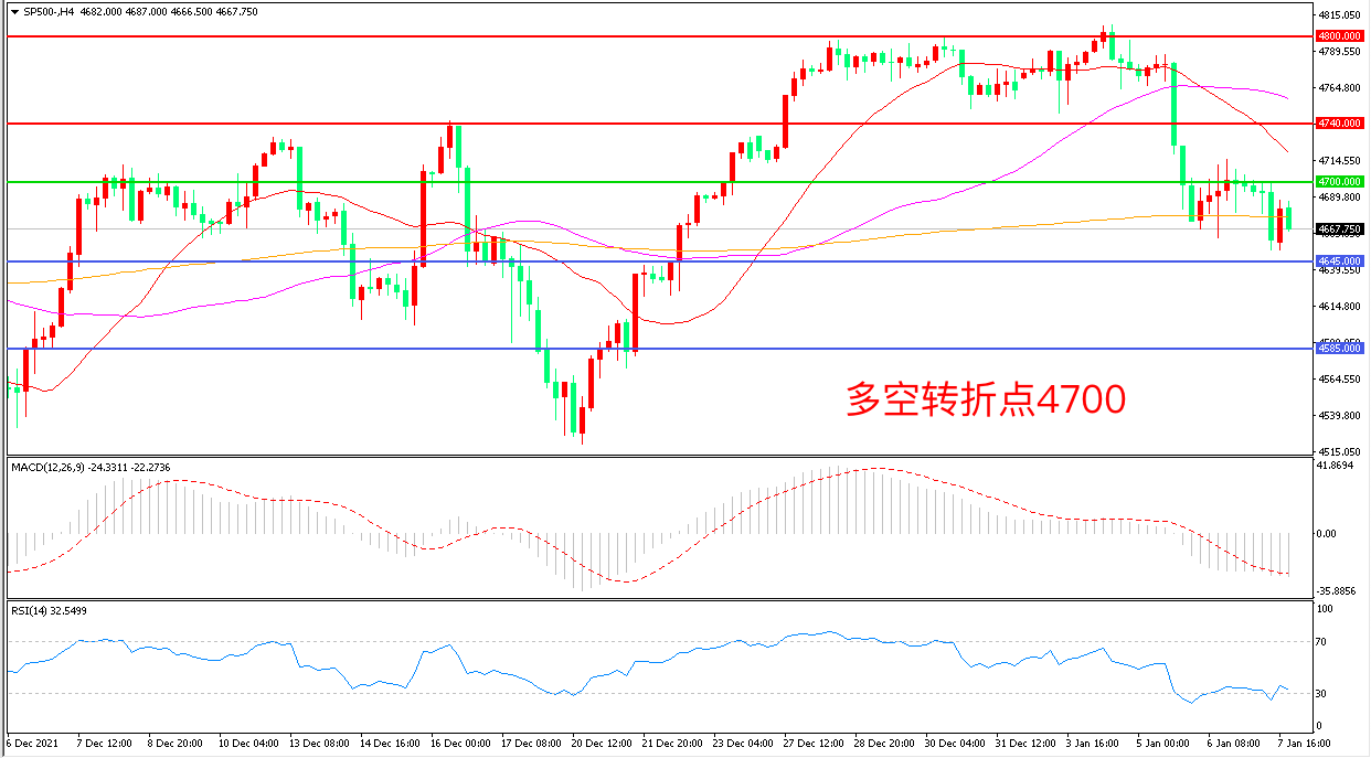 4小时图看,标普500长阴连续下破,空头趋势明显,4700成为上方阻力,4645成为下方支撑,MACD绿柱增加,RSI指标走平,日内震荡下行概率较大。