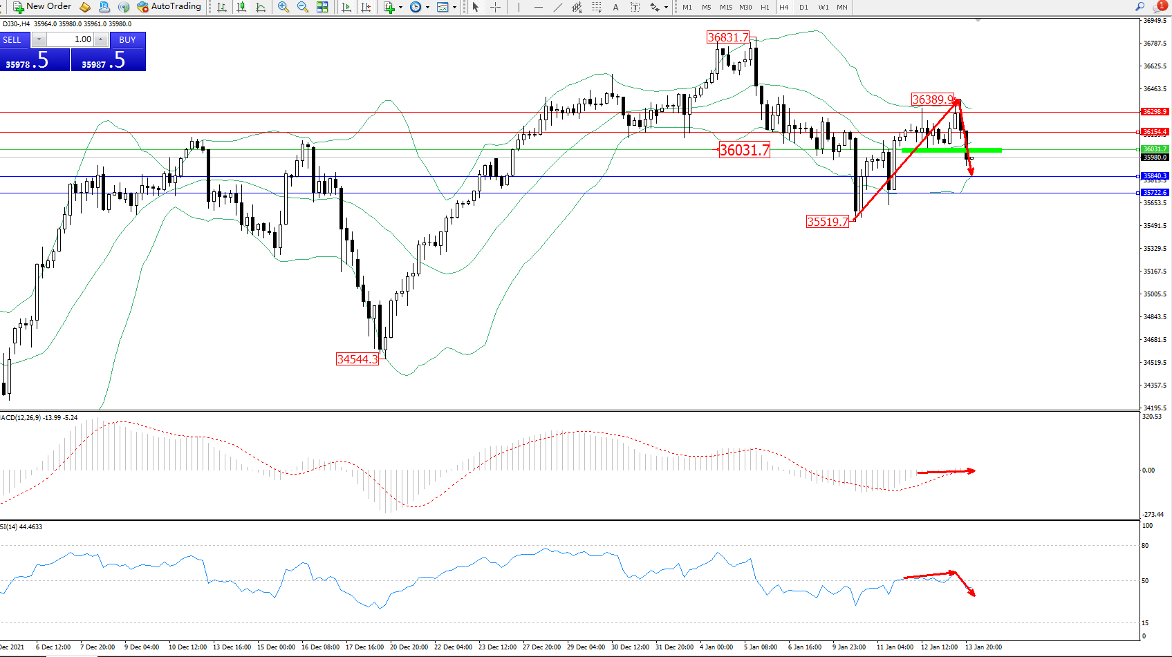 道琼斯指数1月13日(周四)收盘下跌175.91点,跌幅0.48%,报36114.41点; 美国国债周四收高,之前30年期国债招标获得了稳固的需求,并且5年期国债期货出现了三笔大宗交易。美国股市遭到抛售以及欧洲债券上涨也提振了美国国债,另外市场预期美国大型银行周五的季度报告之后将出现金融债券的发行,也将利好国债。中期国债领涨,收益率下降多达5个基点;10年期国债收益率收于1.70%左右,较周三收盘下降约4个基点。220亿美元30年期国债的发行给曲线远端带来支持;尽管中标收益率略高于发行前交易水平,但一级交易商获配17.9%,低于之前一次,间接投标人获配比例提高到65%。