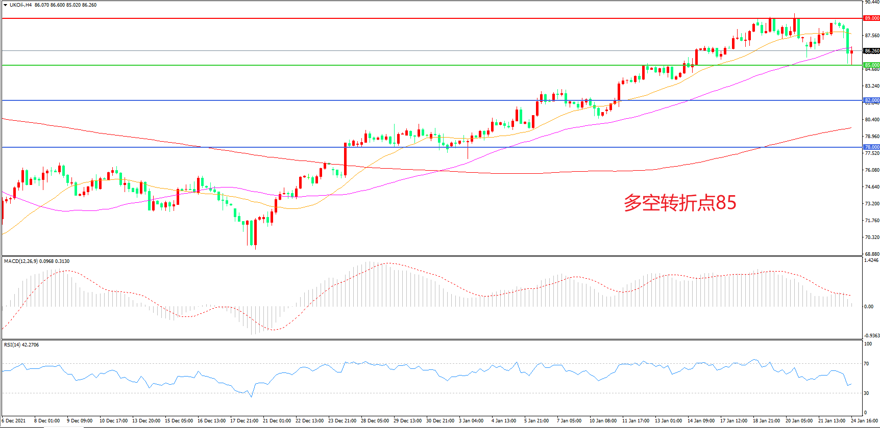 4小时图看,油价围绕89美元震荡后破位下行,上行趋势暂缓,85美元成为下方支撑,MACD红柱缩短,RSI指标走平,日内延续震荡概率较大。