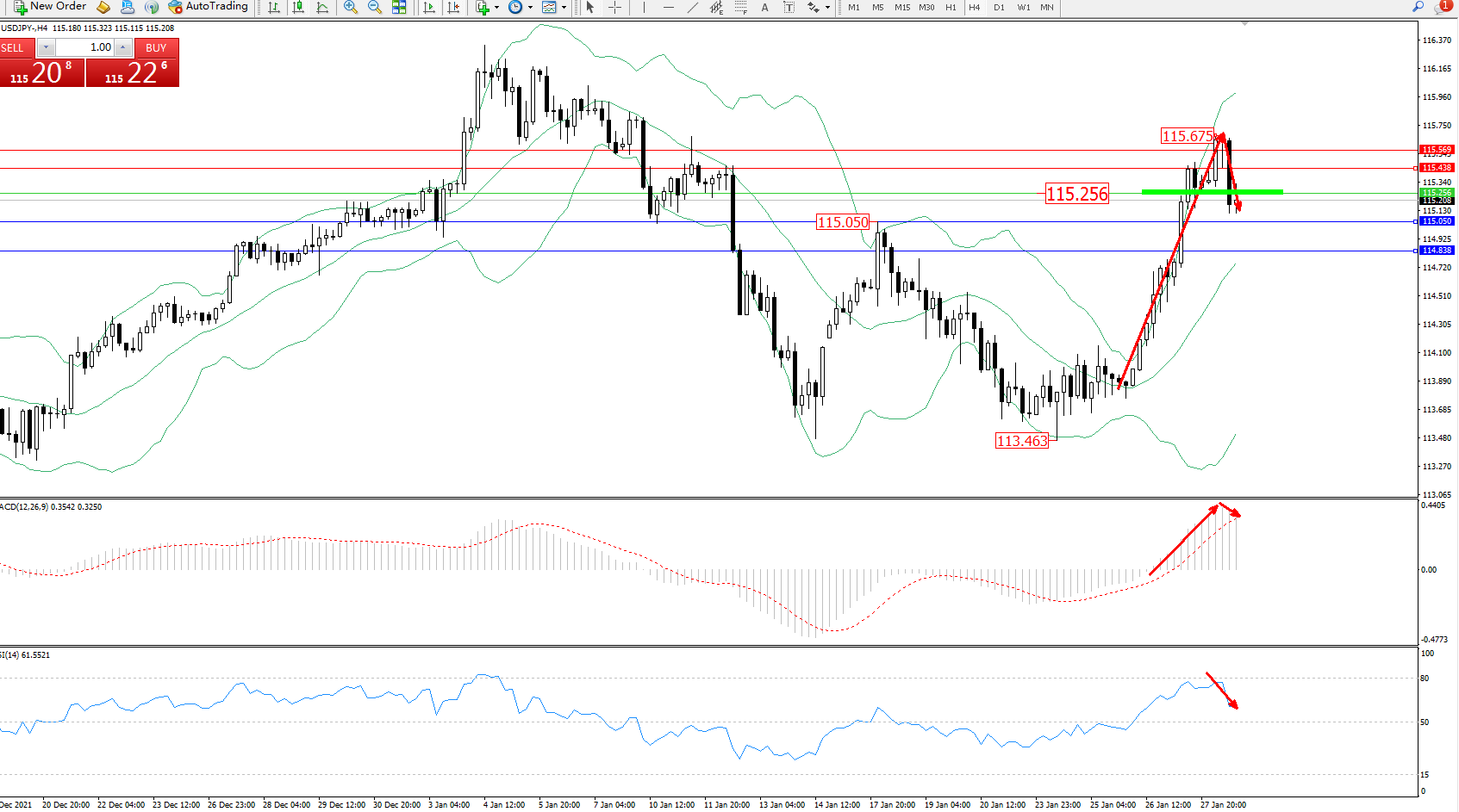 技术点评:多头动力延续布林带指标上轨附近强势拉升上扬,高位抵达115.675位置附近遇阻回撤,短期高位空头动力伺机入场下行,布林带指标呈张口走势后开始收口上移,MACD指标处于多头区域维持震荡上移后回撤,RSI指标处于多头区域维持震荡上移后平移,急速转势下行;