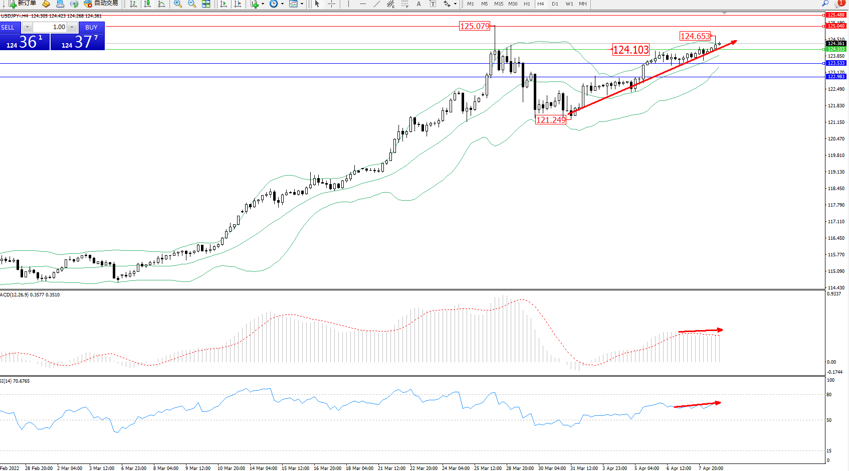 技术点评:多头动力延续布林带指标通道中上轨区间持续震荡上扬,高位抵达124.653附近节点后开始整理,短期多头拉升态势良好,前期高位125.079位置近在咫尺,破位在即,布林带指标呈收口走势不断拉升上扬,MACD指标处于多头区域维持整理平移,RSI指标处于多头区域维持弱势徘徊后开始向上移动;