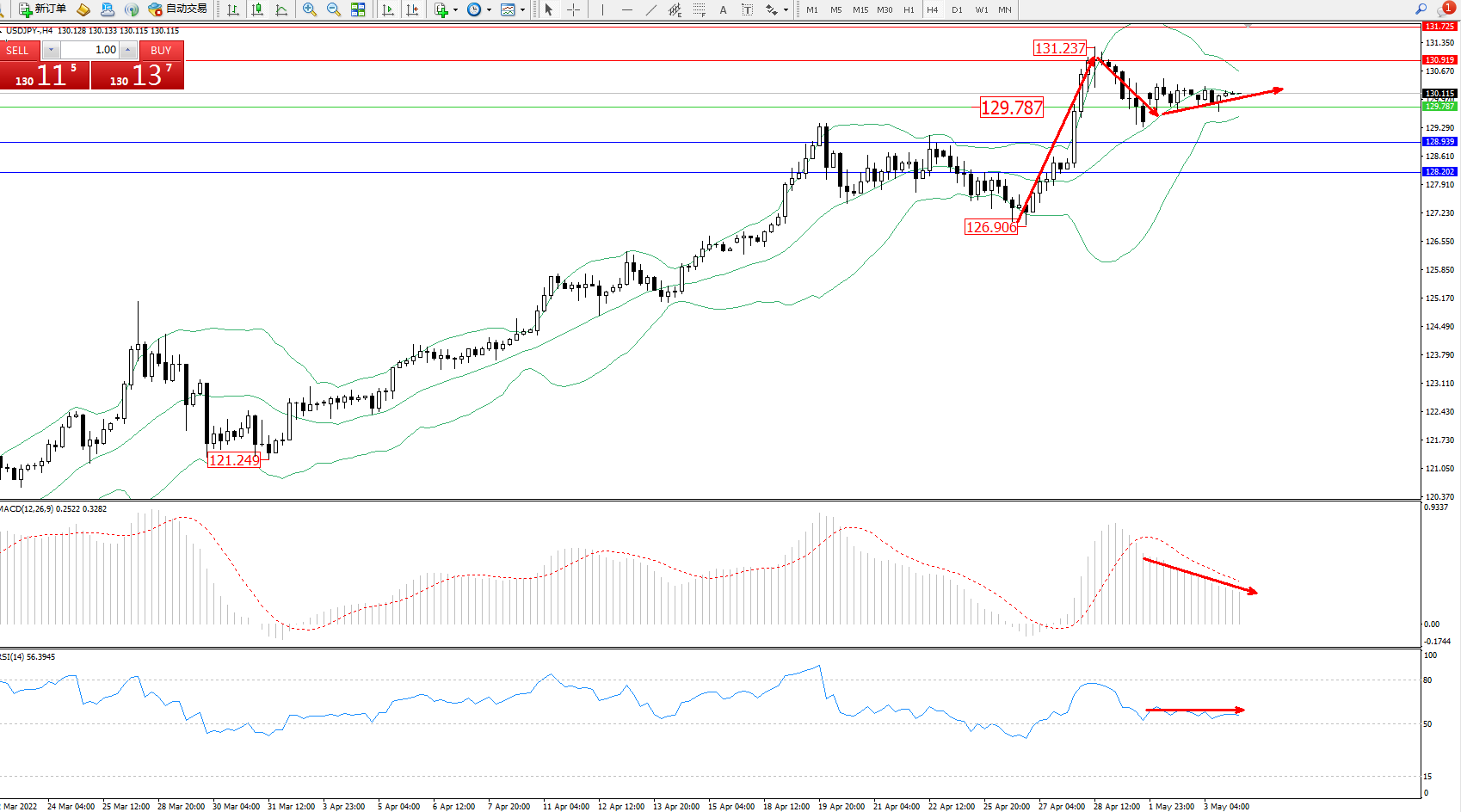 技术点评:多头动力延续布林带指标通道中上轨区间持续震荡上扬,高位抵达131.237附近节点后回撤整理平移,短期纠结于中轨附近弱势徘徊中,布林带指标呈收口走势持续平移,波幅空间逐渐收窄,MACD指标处于多头区域维持弱势下行,RSI指标处于50均衡线上側弱势窄幅整理平移中;