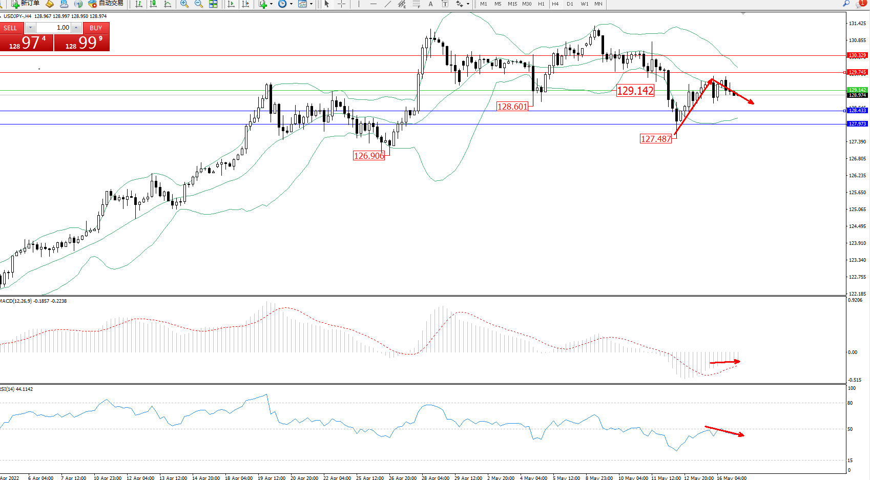 技术点评:空头动力延续布林带指标下轨附近持续震荡下挫,低位抵达127.487附近节点后快速回撤,纠结于布林带指标中轨附近节点弱势震荡下行,布林带指标呈收口走势持续中,MACD指标处于0轴线下方空头区域维持弱势徘徊,RSI指标处于50均衡线下侧维持窄幅整理平移;
