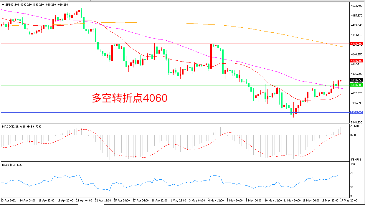 4小时图看,标普500以21周期均线为依托横盘震荡,短期看有回暖迹象,均线系统走平,MACD红柱增加,RSI指标走平,日内震荡上行概率较大。
