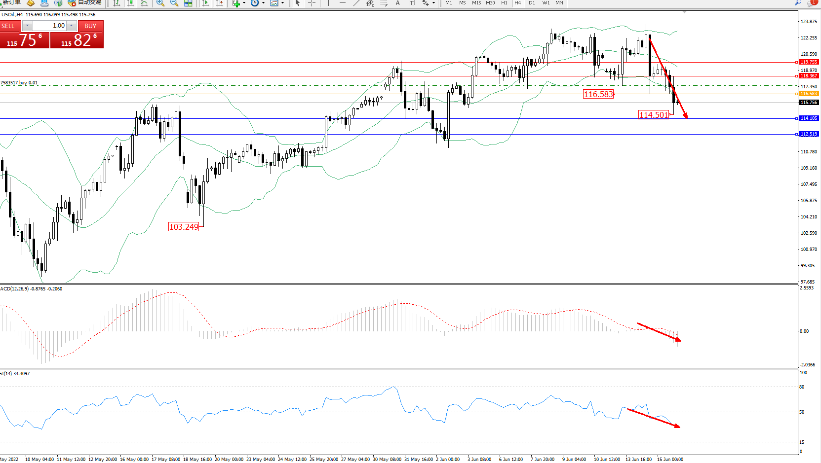 技术点评:长时间维持高位布林带指标通道内宽幅震荡,波幅空间逐渐张口,空头动力延续布林带指标下轨附近持续下挫,低位抵达114.501附近节点后震荡,短期空头动力有急速回撤迹象,MACD指标处于0轴线下侧维持弱势下行中,RSI指标处于50均衡线下侧不断下移;