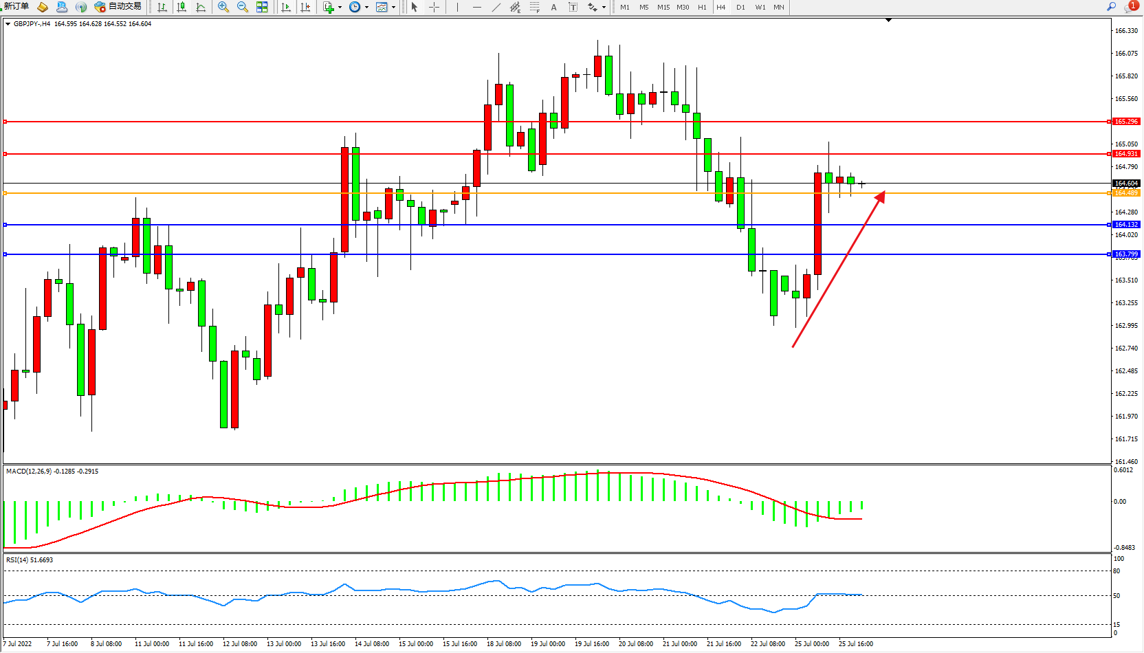 4小时图看:多头动力强势拉升上扬,短期遇阻整理,多头有继续向上移动迹象,MACD指标处于空头区域维持整理缓慢上移,RSI指标处于50均衡线附近窄幅整理;