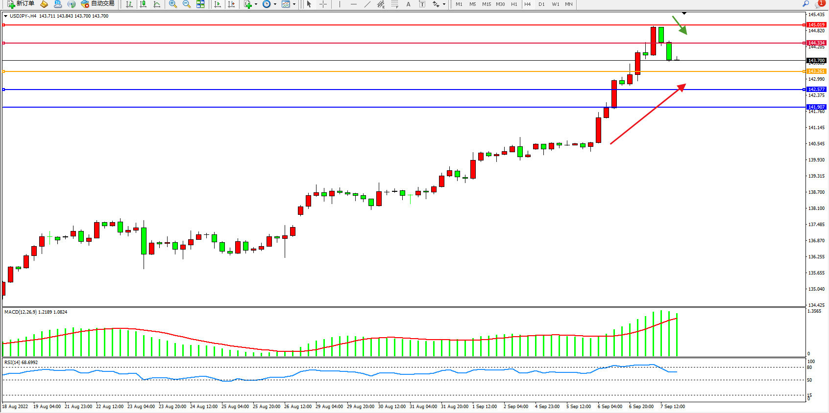 交易策略:143.261上方看涨,目标144.334、145.019