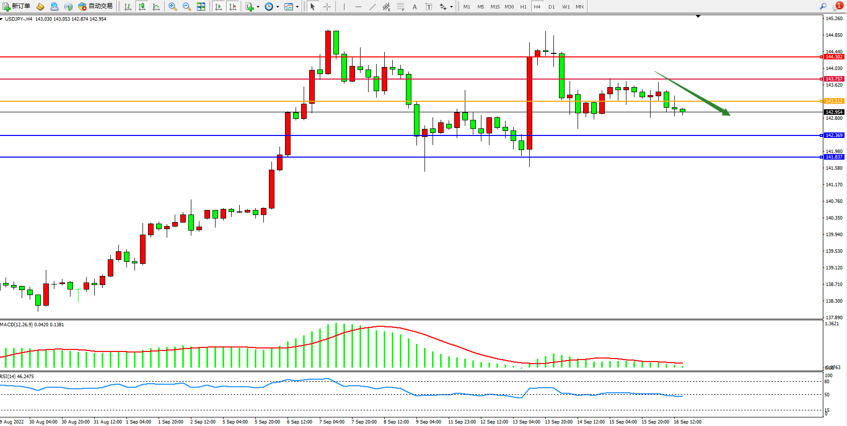 4小时图看:高位空头动力维持弱势整理缓慢下行,短期跌势或将延续,市场整体空头情绪开始涌现,MACD指标处于0轴线上側徘徊,RSI指标处于50均衡线下侧窄幅整理;