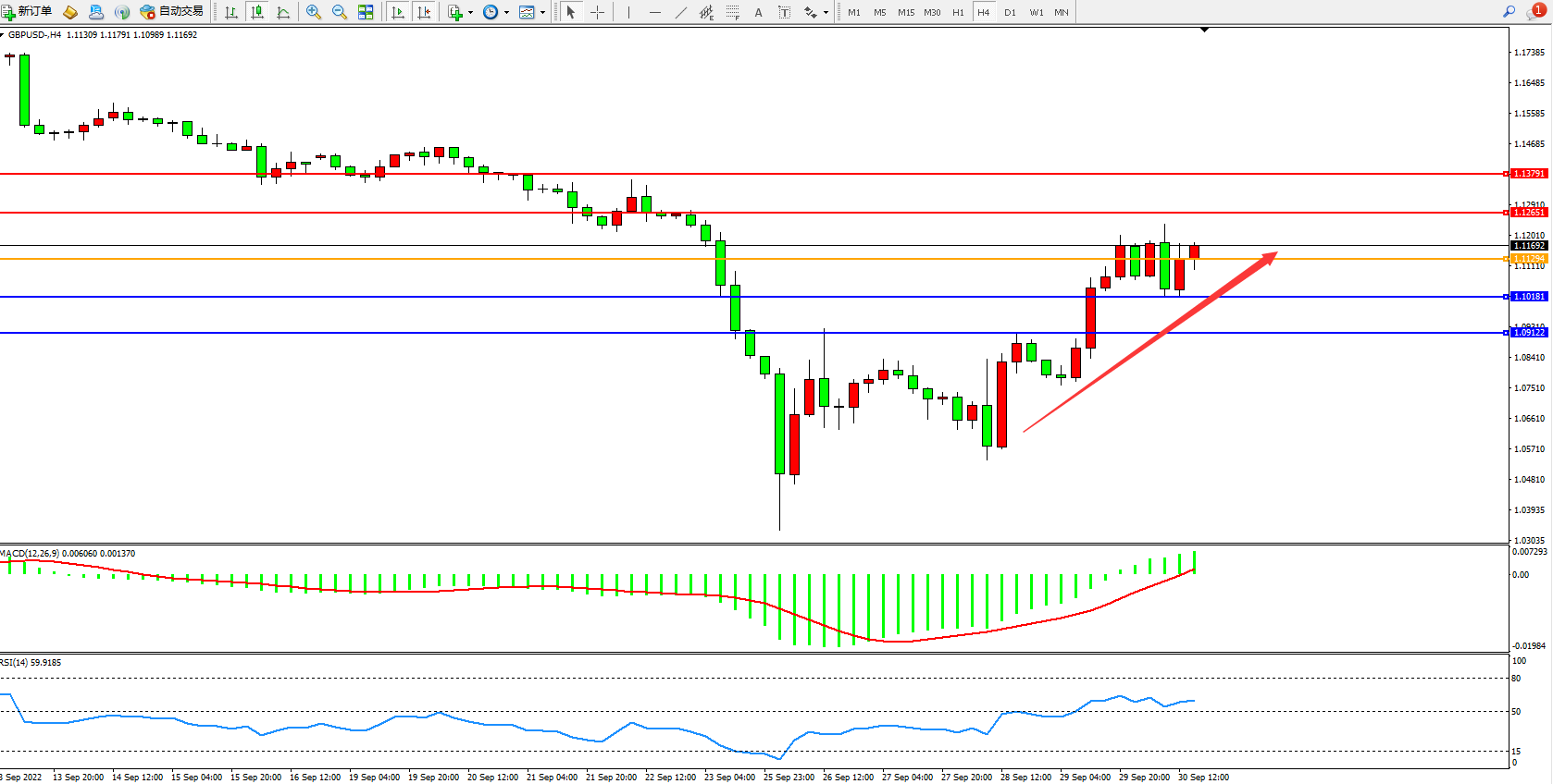 英镑兑美元维持1.11692附近震荡,英国央行的举措所带来的英镑上涨是不可持续的。任何时候央行在进行临时干预计划时,市场肯定会对此进行测试,看看央行是否会继续这样做。但我预计英镑不会跌到与美元平价之下。