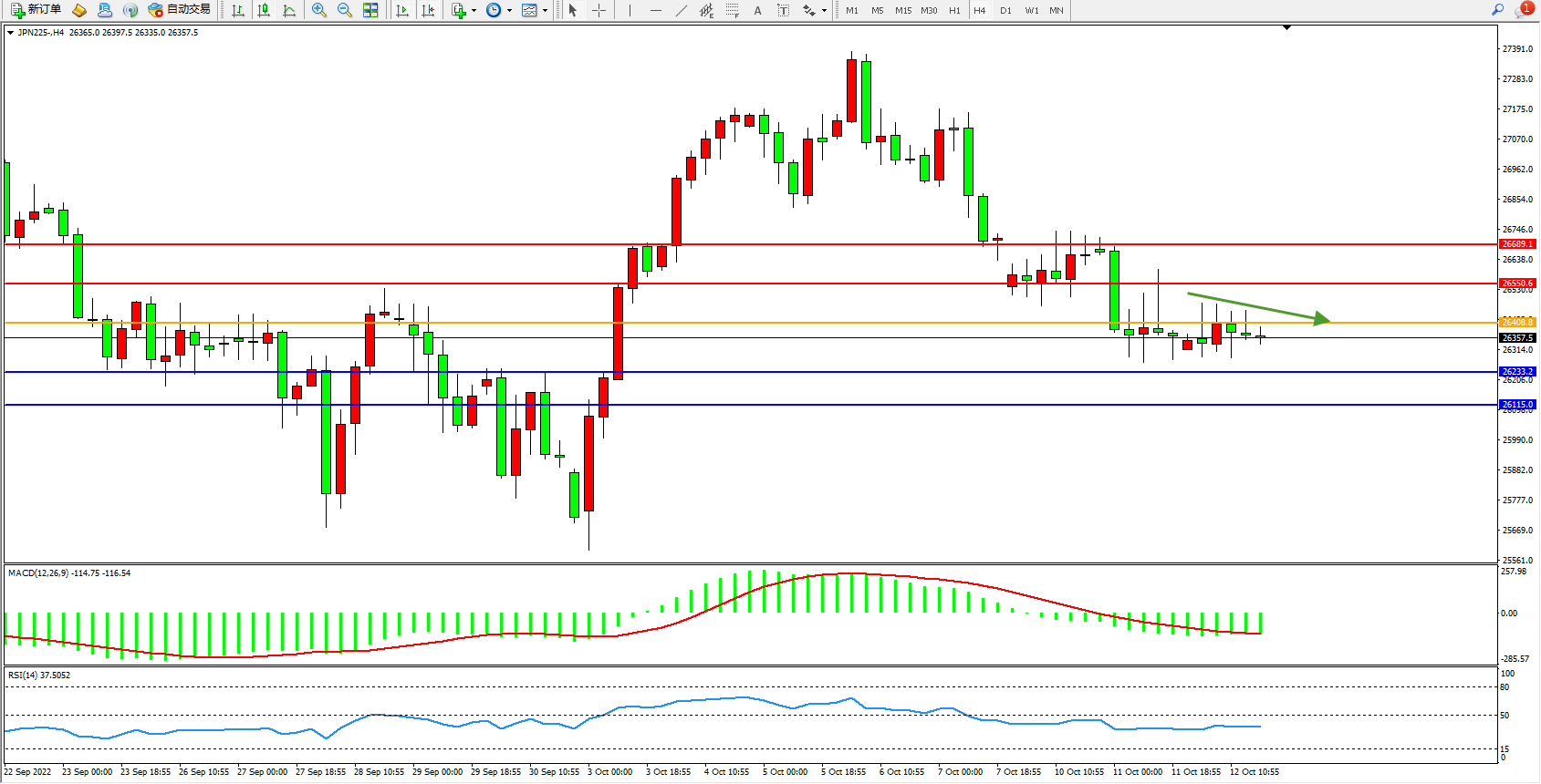 日经225指数10月12日(周三)收盘下跌6.25点,跌幅0.02%,报26395.00点。日本昨日重启免签自由行,零售、消费服务、交通运输股走强,日本8月核心机械订单额环比下降5.8%,预期为下降2.8%。
