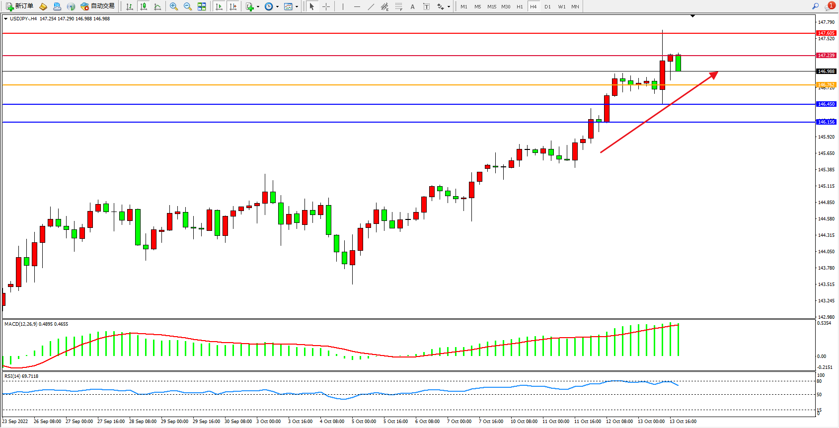 4小时图看:多头动力维持震荡上扬走势态势良好,短期看涨情绪不断介入,且未见有止步迹象,MACD指标处于多头区域高位徘徊,RSI指标处于超买区80均衡线附近整理;