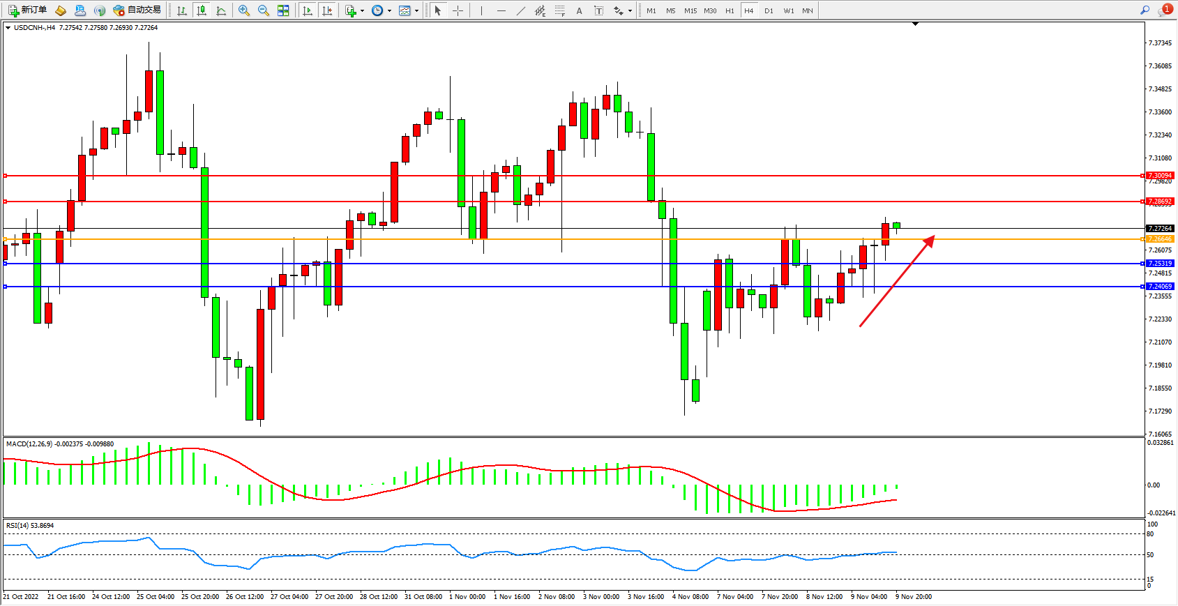 交易策略:7.26646上方看涨,目标7.28692、7.30094