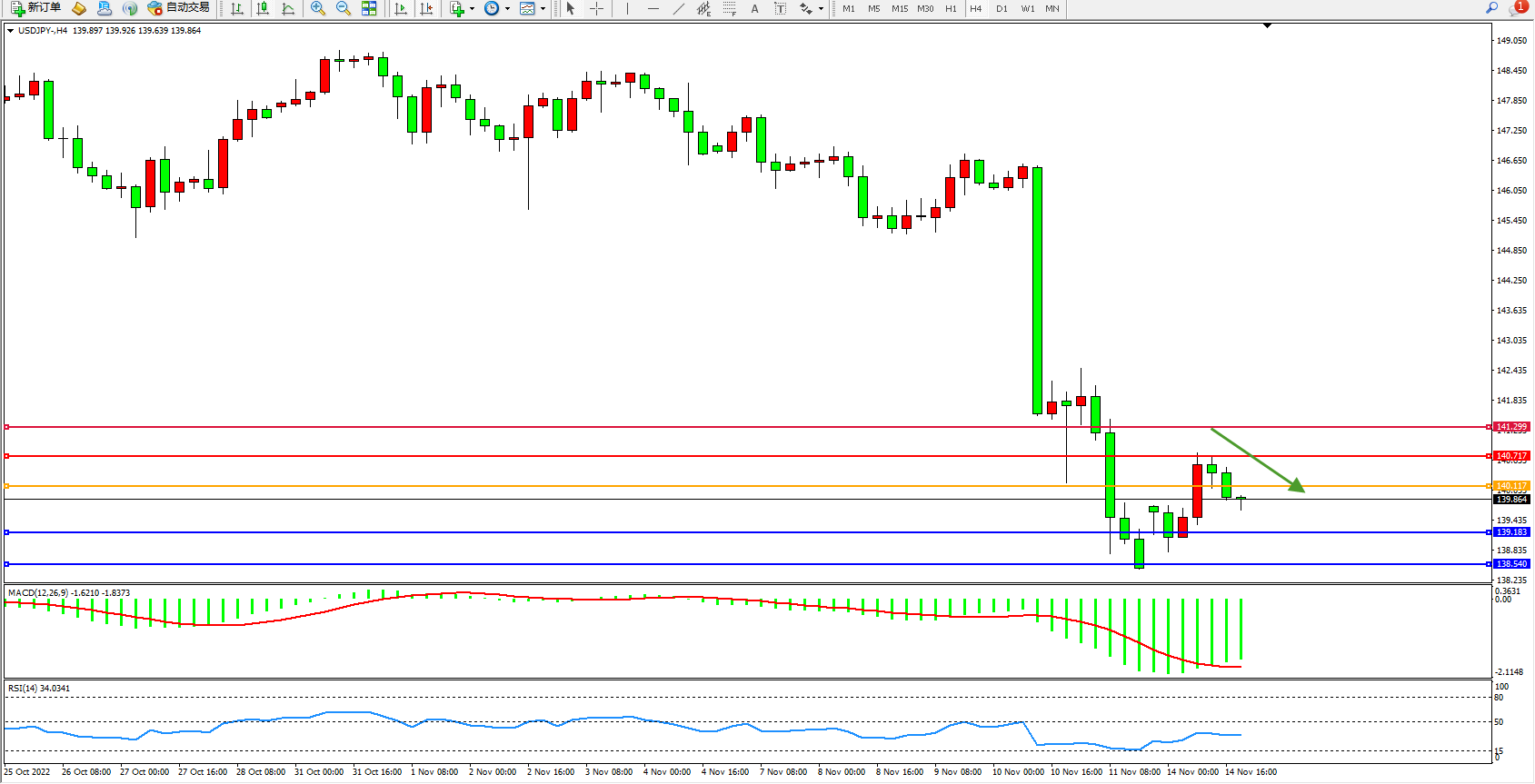 交易策略:140.117下方看跌,目标139.183、138.540