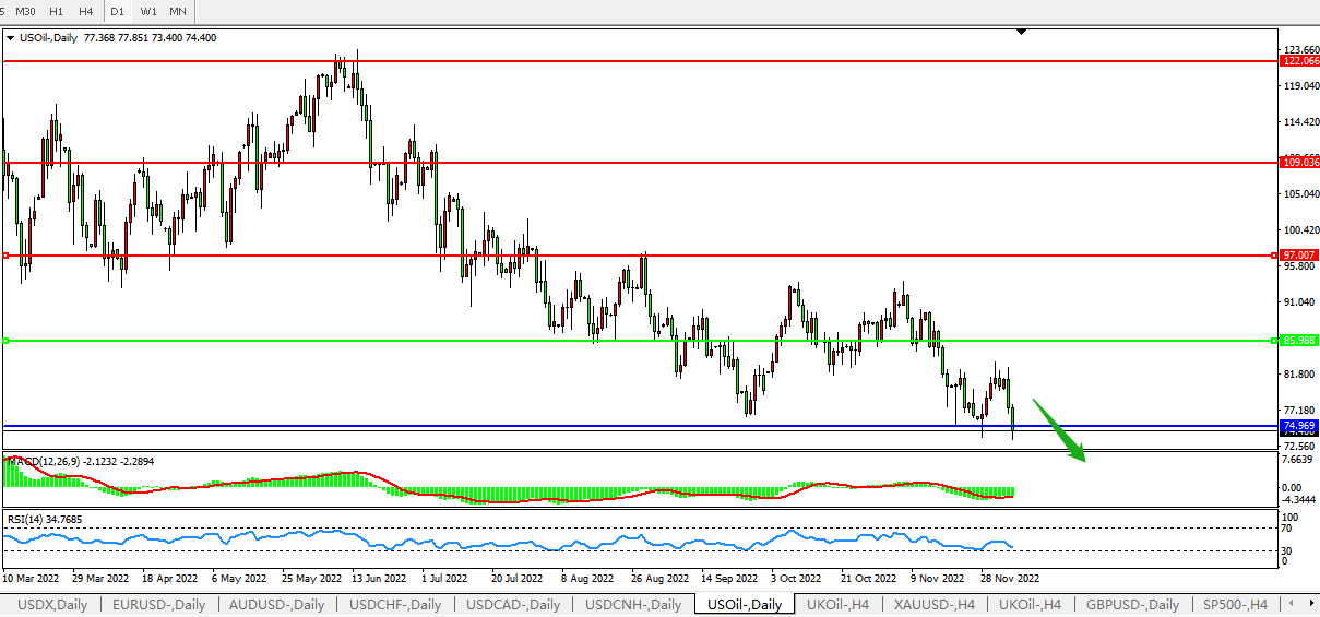 日线图看:油价再次下行试探新低, MACD量能柱0轴下方开始放量,RSI再度下行,短期油价继续下行概率较大。