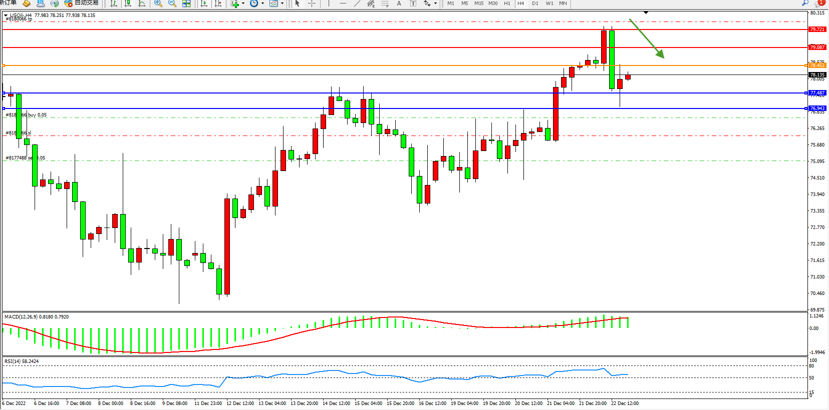 交易策略:78.453下方看跌,目标77.487、76.943