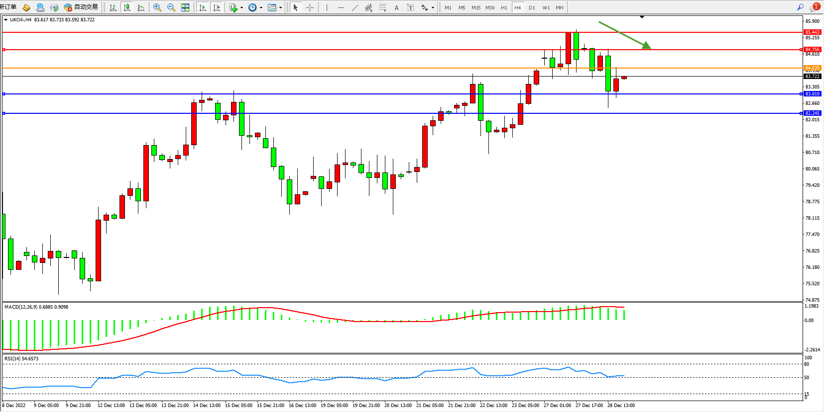 4小时图看:高位空头动力震荡下行,短期跌势持续,市场看空情绪笼罩,MACD指标处于多头区域整理,RSI指标处于50均衡线上側弱势徘徊;