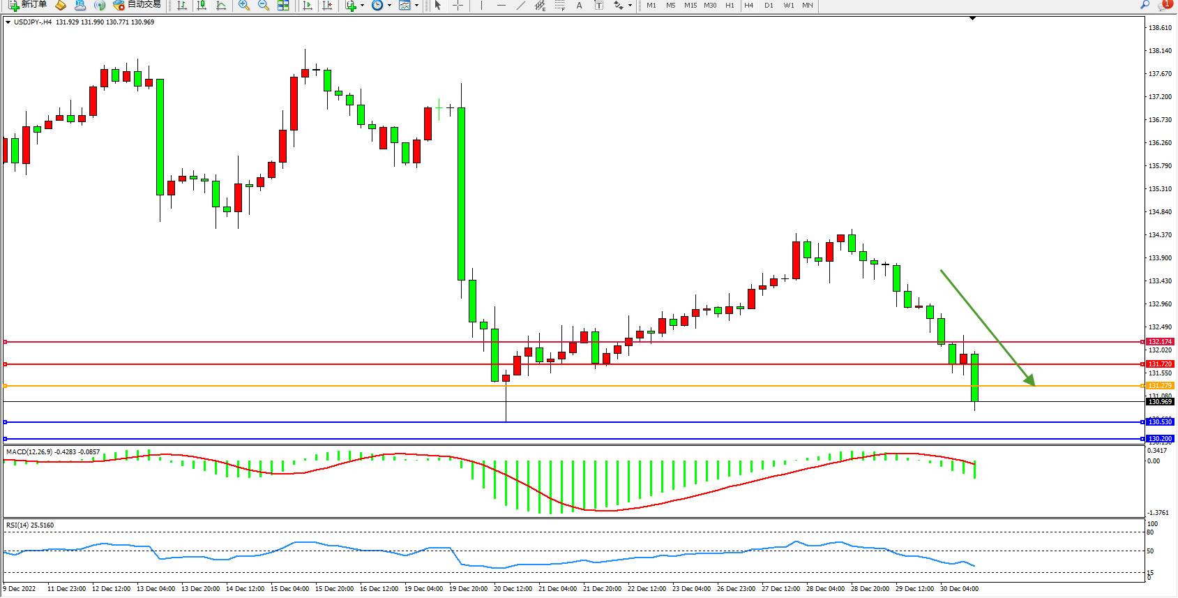 交易策略:131.279下方看跌,目标130.530、130.200