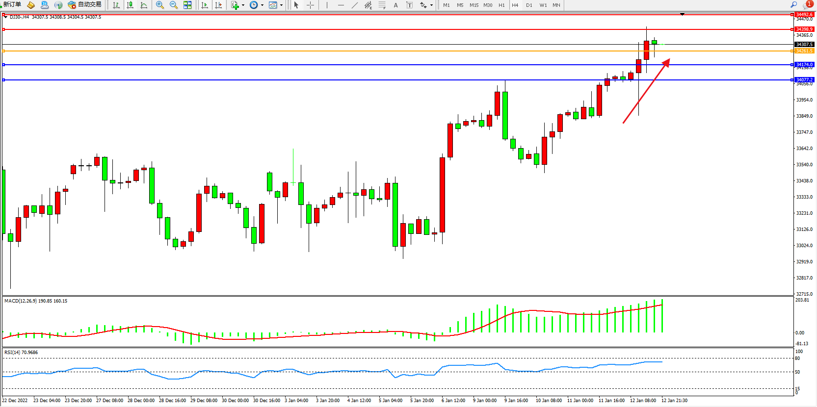 道琼斯指数1月12日(周四)收盘上涨216.24点,涨幅0.64%,报34189.25点;美国12月未季调核心CPI年率 5.7%,预期5.70%,前值6.00%,创2021年12月以来最小增幅。CPI报告公布后,美国短期利率期货下跌,交易员押注美联储将进一步收紧政策。