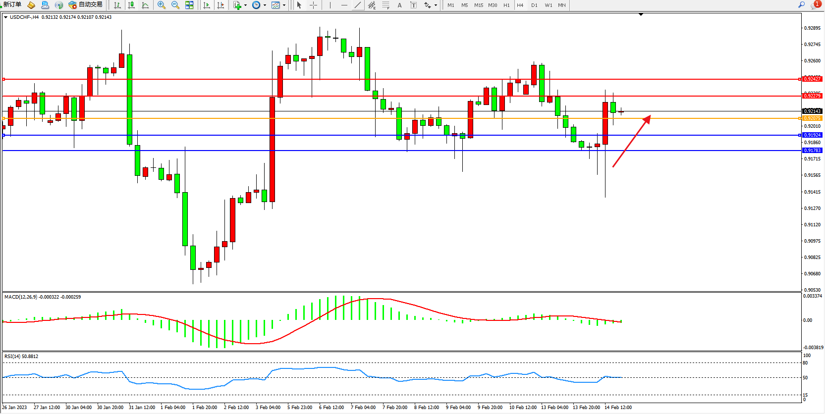 美元兑瑞郎维持0.92143附近震荡, 美国1月未季调CPI年率录得6.4%,为连续第7个月下降,创2021年10月以来最小增幅。