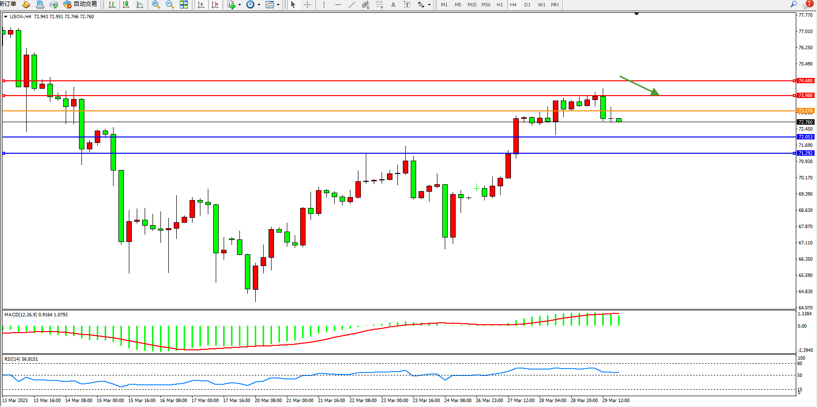 原油维持72.760附近震荡,美国至3月24日当周EIA原油库存 -748.9万桶,预期9.2万桶,前值111.7万桶。EIA俄克拉荷马州库欣原油库存 -163.2万桶,前值-106.3万桶。