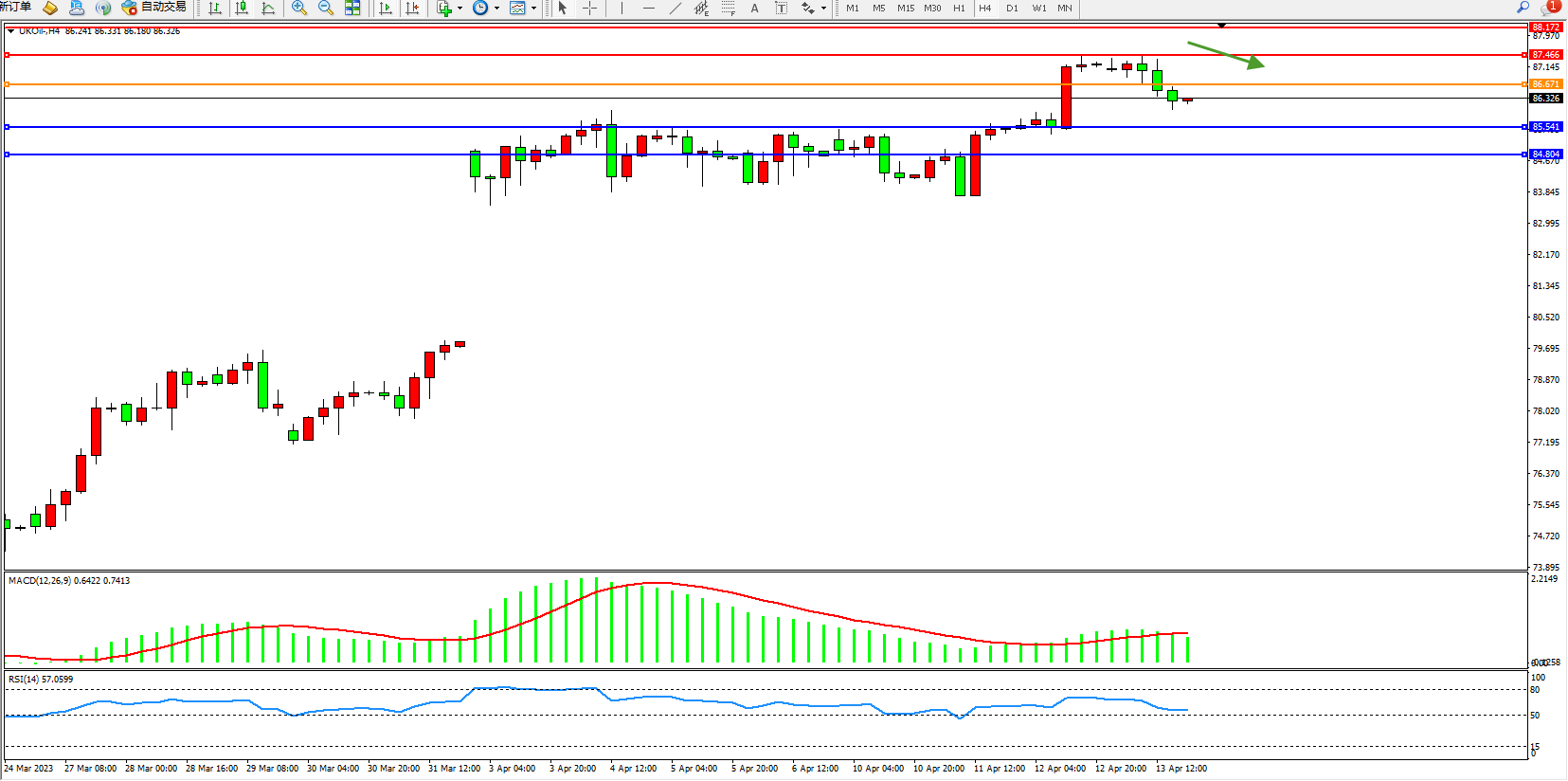 4小时图看:高位空头动力整理回撤,市场空头情绪开始逐渐涌现,短期跌势或将延续,MACD指标处于多头区域维持整理,RSI指标处于50均衡线上側徘徊;