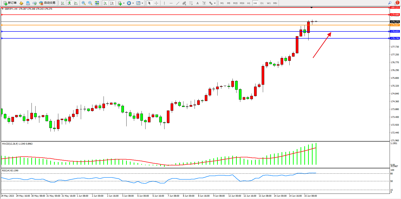 英镑日圆GBPJPY——4小时K线图显示: