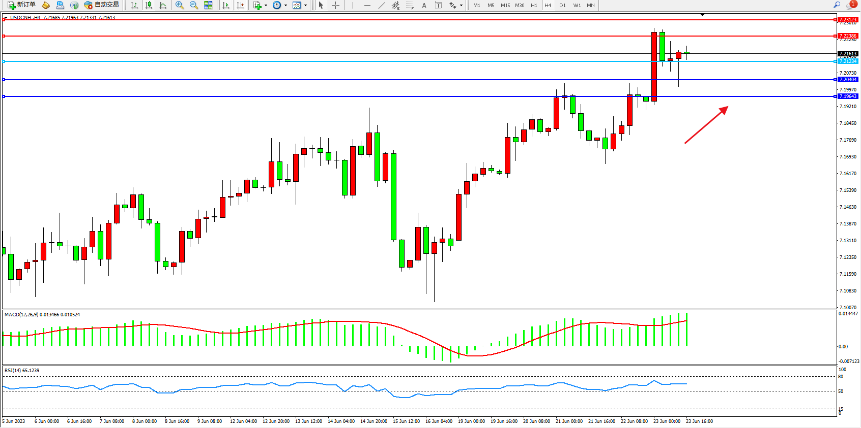 交易策略:7.21234上方看涨,目标7.22386 7.23123