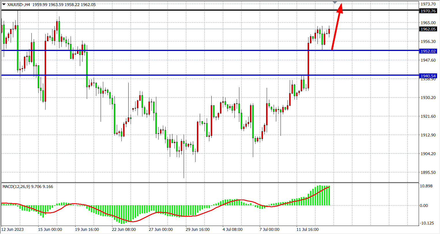 4小时图看,黄金大涨接连上破阻力,MACD量能在零轴上放量,行情上行趋势明显,支撑上移1945-1952附近,上方阻力关注1970-1983。