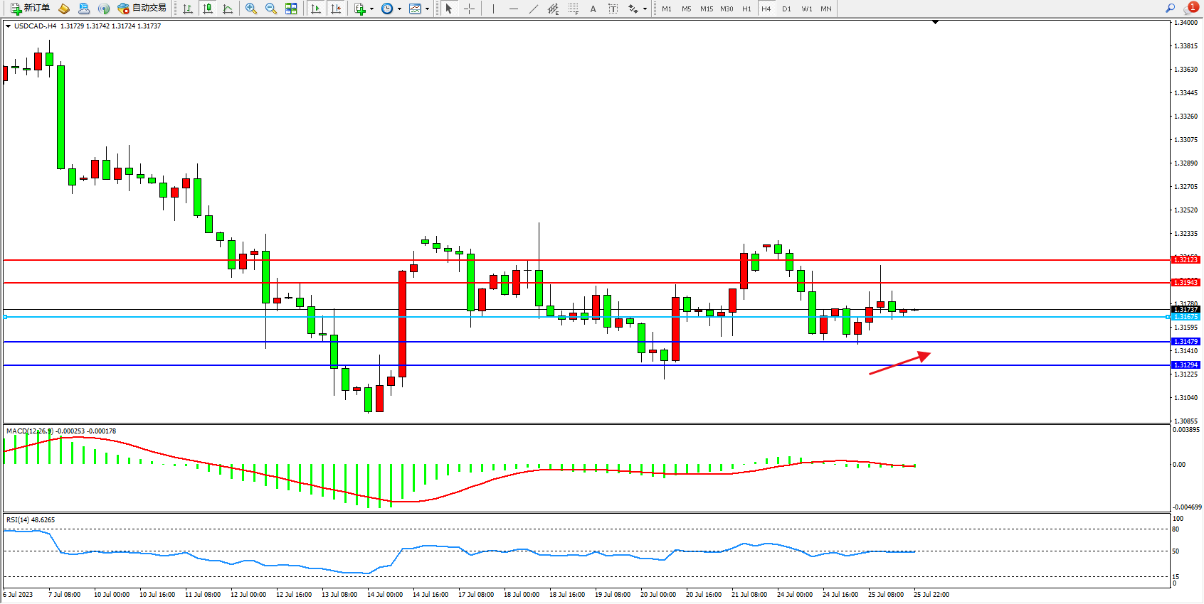 4小时图看:多头动力缓慢整理向上移动,短期看涨情绪涌现,MACD指标处于0轴线附近徘徊,RSI指标处于50均衡线附近弱势整理;