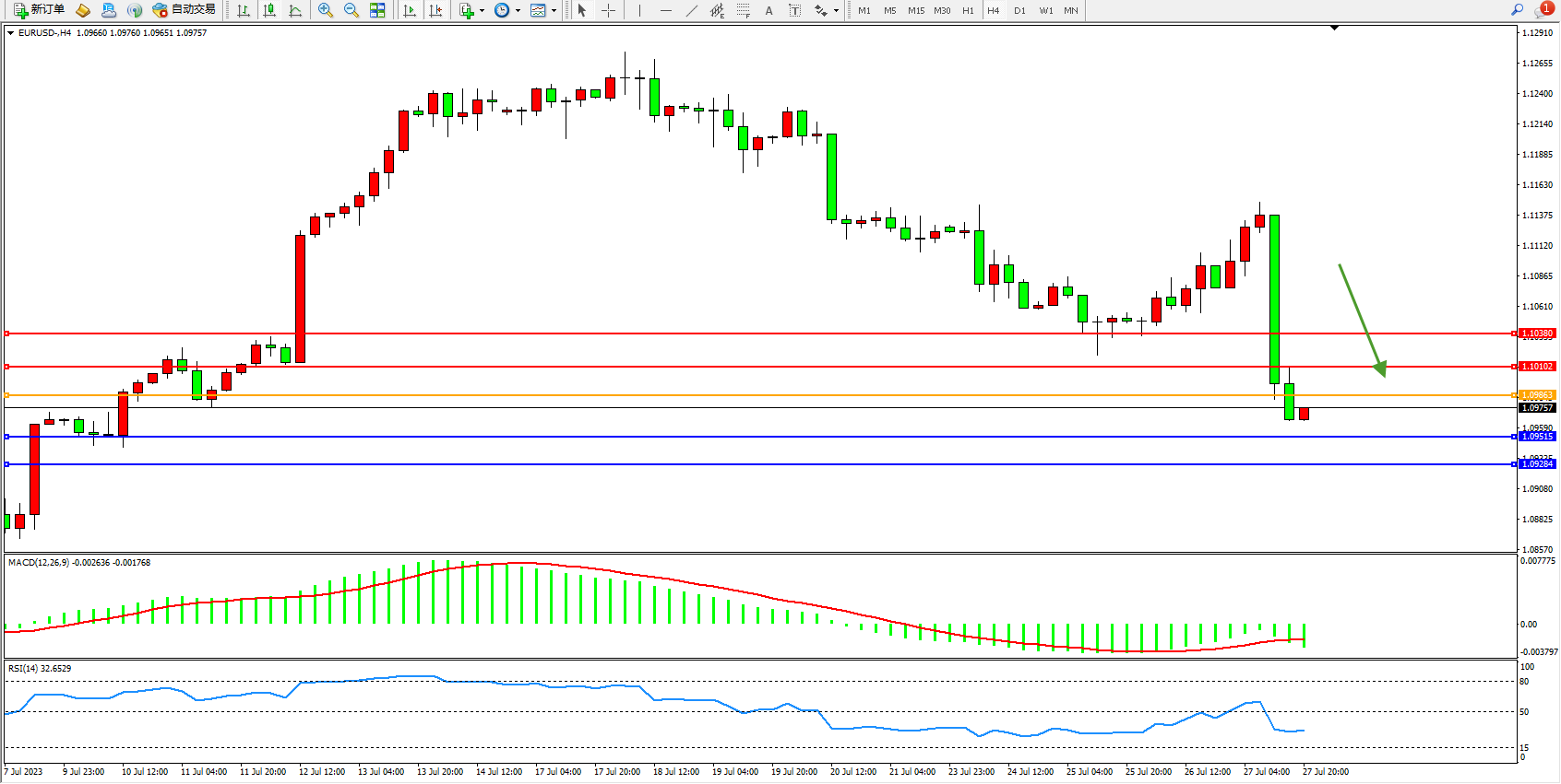 欧元兑美元维持1.09757附近震荡,欧元区至7月27日欧洲央行主要再融资利率 4.25%,预期4.25%,前值4.00%。欧洲央行将三大主要利率均上调25个基点,为连续第九次加息,符合市场预期,利率达到2008年9月以来最高水平。