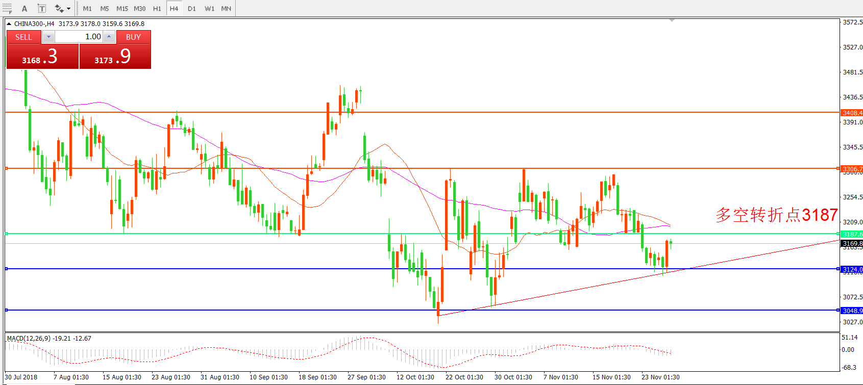 小时图看,CHINA300中华指数下行后触碰短期价格趋势线止跌,下方支撑暂时有效,均线下穿,有形成死叉迹象,MACD绿柱缩短,短期内以震荡为主。