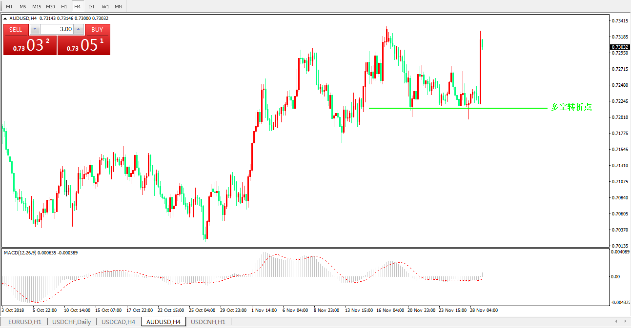技术面简析:H4周期显示,均线MA14上穿MA21,汇价开始强势。