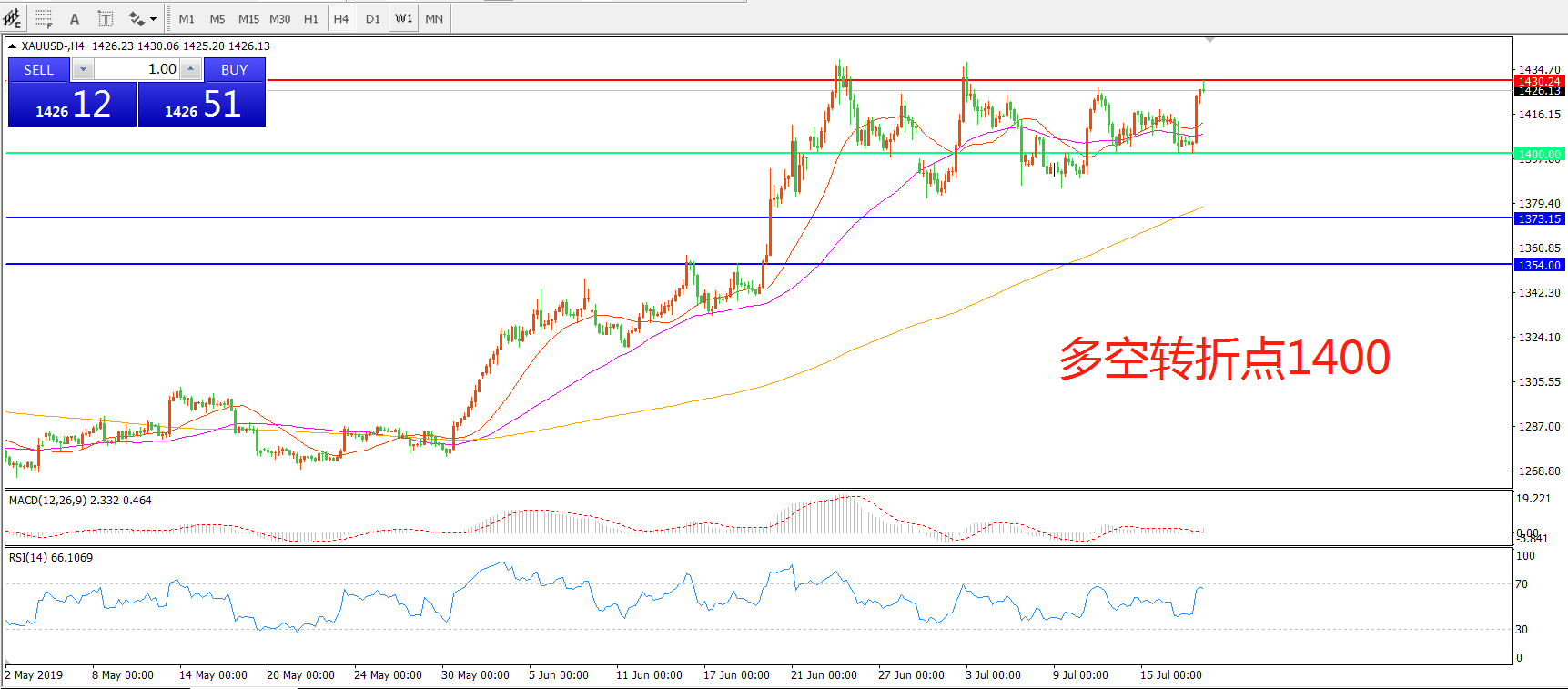 美联储主席鲍威尔在法国央行于巴黎举行的晚宴上表示,美联储正在密切监控美国经济增长的下行风险,这种前景的不确定性有所增加,特别是在贸易发展和全球经济增长方面,美联储将采取适当行动维持扩张。央行的宽松预期大幅推升了金价走势,现货黄金自低点大幅攀升,上涨幅度接近25美元,触碰前期阻力1430附近暂时止步,最终收报1425.9美元/盎司。