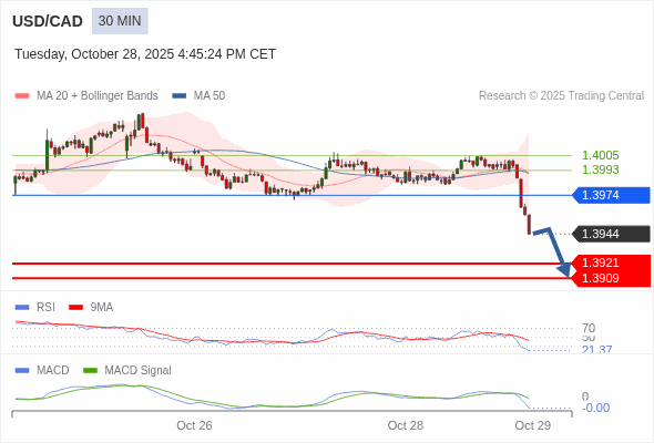 技术点评: RSI技术指标小于30。在这种情况下,说明有很强的下跌趋势,或者意味着处在超卖的状态下,可能会有向上的反弹。我们将观察RSI技术指标是否出现背离现象。 MACD技术指标处在其信号线之下看空。 配置为负。 此外,价位低于其20天及50天移动平均线 ( 分别位于1.3991 和1.3991 )。 最后,价位跌破其布林线通道下轨 (位于1.3959。