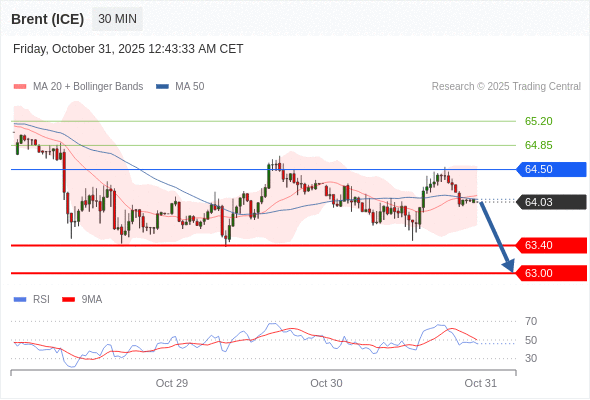 交易策略: 在 64.50 之下,看跌,目标价位为 63.40 ,然后为 63.00 。