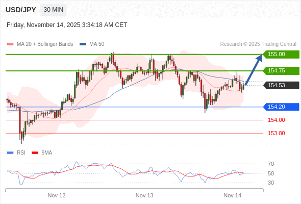 在 154.20 之上,看涨,目标价位为 154.75 ,然后为 155.00 。