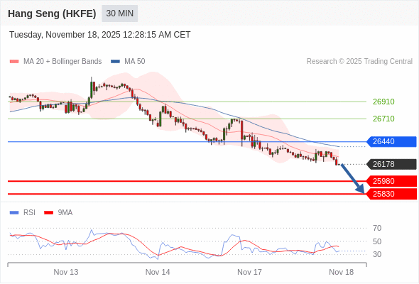 香港恒生指数期货 当日内: 下跌趋势。
