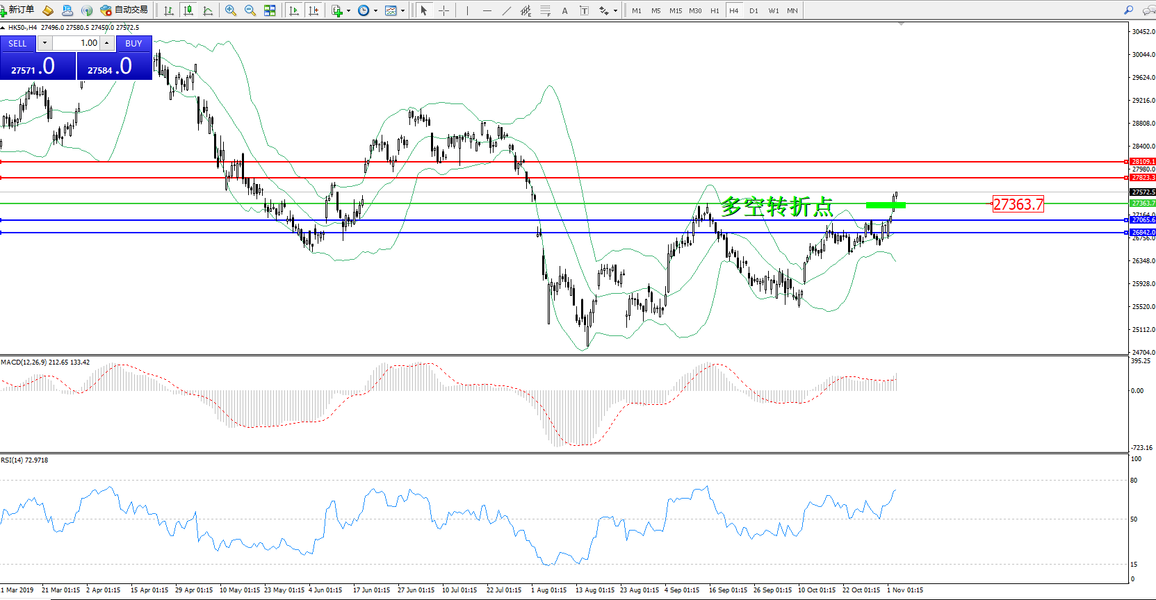 香港恒生指数11月4日(周一)收盘上涨446.54点,涨幅1.65%,报27547.30点;港股随A股牵引全天震荡上涨,买盘支持而扩大升幅。恒指高见27499,香港金管局跟随外围降息充盈了市场流动性,给谨慎的气氛带来提振,而随着A股大幅反弹市场关注更多消息。现外围欧美市场均大幅收涨支持港股延续升势,市场关注的焦点贸易谈判取得新进展,且可能很快签署部分协议,给市场带来一定信心,因此,料港股有望延续升势,可留意绩优股。