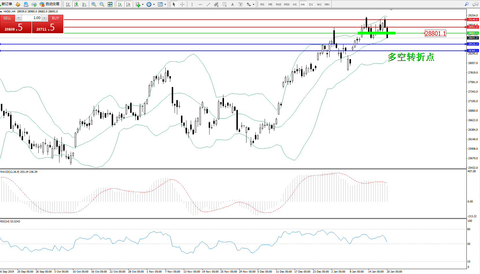 香港恒生指数1月20日(周一)收盘下跌260.51点,跌幅0.90%,报28795.91点;跌破29000点,午后恒指跌幅进一步扩大。截至收盘,恒指跌0.9%,报28795.91点。港股市场呈下跌行情,主要股指弱势走低。因新型冠状病毒肺炎情况发酵,市场流感概念股全线上涨,在弱势行情下,表现尤为亮眼。5G进程或加快,相关电信股股亦逆势走强。流感概念股全线大涨,东阳光药涨超19%,白云山涨9%,中国中药涨超8%,四环医药、同仁堂科技皆涨。全球景气周期可能逐步见底,流动性整体仍然宽松,资金流入股市的趋势仍在继续,市场整体估值并不高,港股估值相对更具吸引力。