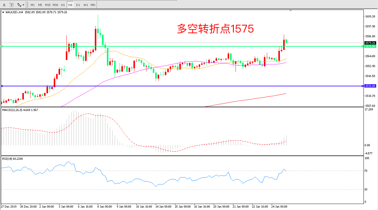 4小时图看,金价跳空高开强势突破1575阻力短期走势偏强,均线系统有拐头迹象 MACD红柱增加RSI指标向上,短期金价维持上行概率较大。