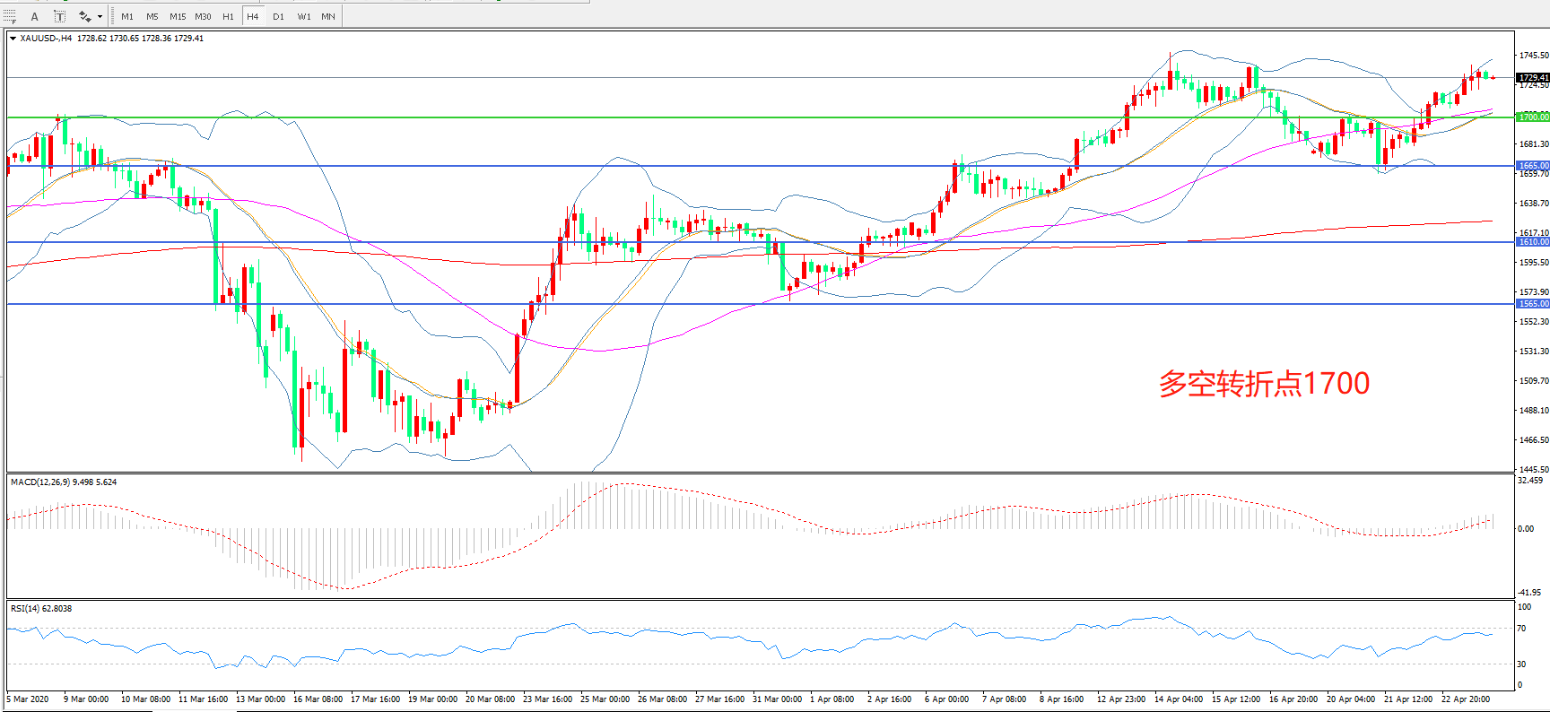 周四(4月23日),美元指数自高位迅速跳水,现货黄金随之反弹,收报1729.90美元/盎司,目前美国众议院议员齐聚华盛顿,试图通过一项4840亿美元的新冠疫情救助法案,使总获批援救金额达到空前的近3万亿美元,持续升级的刺激政策为金价上行提供了动力。