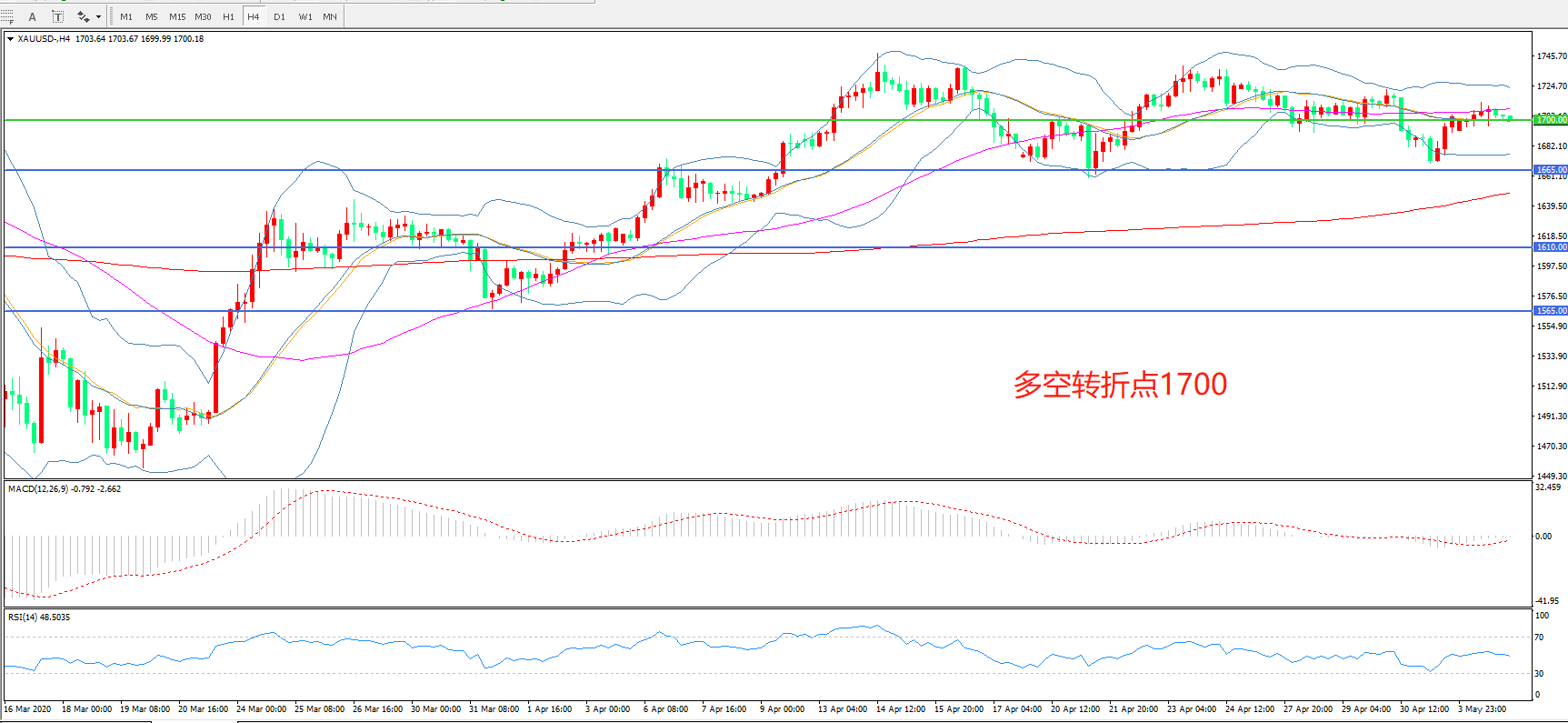 周一(5月5日),亚盘时段,黄金一度跌破1700美元转跌,但很快反弹,美股开盘后一直稳居1700美元上方,收报1700.48美元/盎司。特朗普为推脱抗疫不力责任,企图制造新的贸易纷争,中美贸易摩擦再次引起市场的担忧。