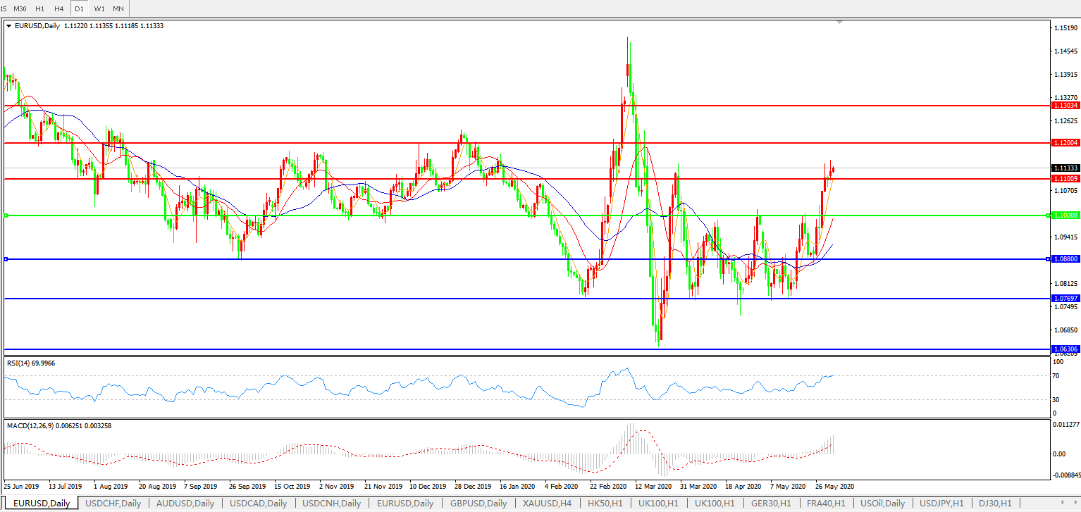 在欧元区,5月制造业采购经理人指数(PMI)从4月触及的纪录低点有所回升,不过工厂活动仍大幅萎缩。然而,日本和韩国的经济活动出现了10多年来的最大降幅。OANDA高级市场分析师Edward Moya在一份报告中称,“金融市场仍乐观认为全球经济仍在复苏。”欧元兑美元一度涨0.32%至1.1136,这是欧元连续第五日上涨,是3月以来最长涨势;交易员关注3月30日高点1.1163上方的止损买盘;最新报1.1132。市场将关注欧洲央行周四的决定,可能宣布更多刺激措施,涵盖欧洲央行会期的隐含波动率下跌。