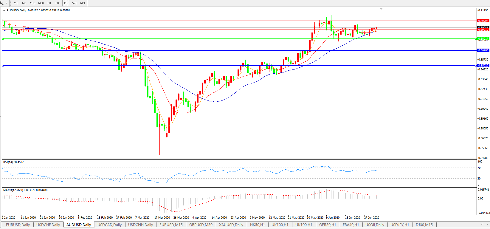技术面简析:日图短期均线高位粘合走平,汇价持续窄幅整理略显强势,MACD运行于0轴上方且量能持续缩量,RSI有走升迹象,预计汇价短线大概率将继续整理,关注0.6800关口支撑。