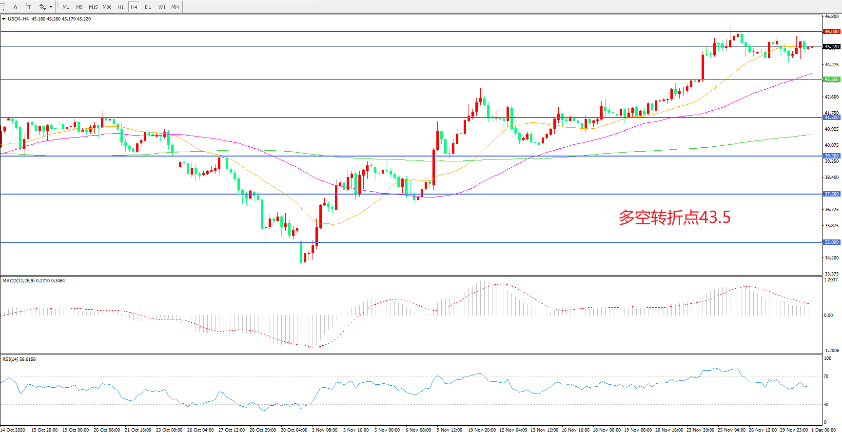 4小时图看,油价延续高位震荡,整体波幅不大,21周期均线成为短期支撑,46美元成为中期阻力,MACD红柱减少,RSI指标走平,日内延续震荡概率较大。