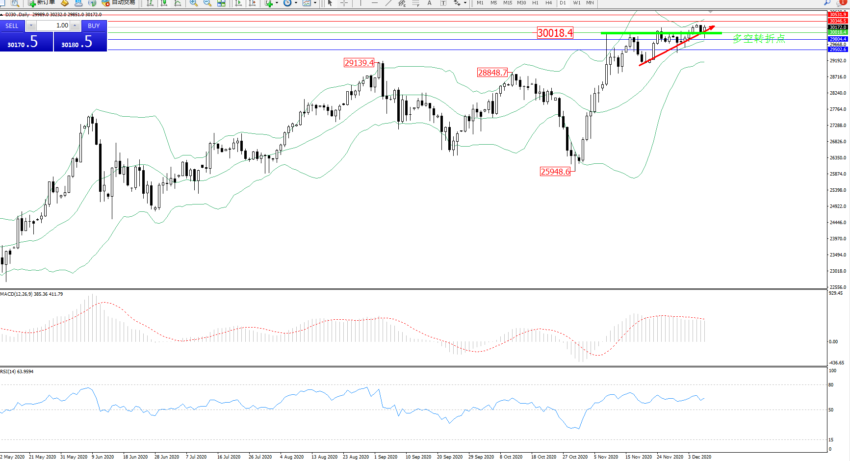 道琼斯指数12月8日(周二)收盘上涨104.10点,涨幅0.35%,报30173.88点。美股三大指数齐收涨,财政刺激谈判前景盖过了新冠病例持续激增之际对于更严格防疫措施的担忧。美国参议院多数党领袖麦康奈尔建议搁置阻碍刺激谈判的一些问题,做出旨在达成协议的战略让步。美国当选总统拜登宣布其医疗卫生团队,承诺100天之内扭转疫情。经过几个月华盛顿高层的不作为之后,市场可能会对任何迈向财政刺激的行动做出积极反应,但是如果这些讨论没有取得成果,市场可能会回吐部分近期涨幅。共和党国会领导人计划与白宫讨论疫情纾困计划;与此同时,在疫苗推出方面的进一步进展也给油价提供了额外的支持。强生和辉瑞周二传出积极的疫苗消息,支撑股市,提振风险偏好,但美元守住涨幅。美国参议院多数党领袖麦康奈尔稍早拒绝支持一份跨党派提案后,据悉他和白宫讨论了纾困方案。