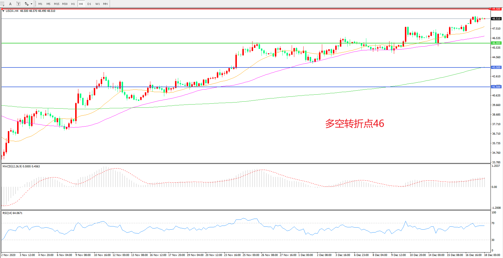 周四(12月17日),在美国年底出台财政刺激的希望支持下,市场风险情绪明显回升,美国WTI原油连续第四日上涨,收报48.51美元/桶。从基本面上看,当前的市场乐观预期仍然主导市场,法国总统马克龙感染新冠的消息也只是让油价盘中短暂回落,油价的动力还是在疫苗改善需求的预期推动,供给端并没有较大的变化,