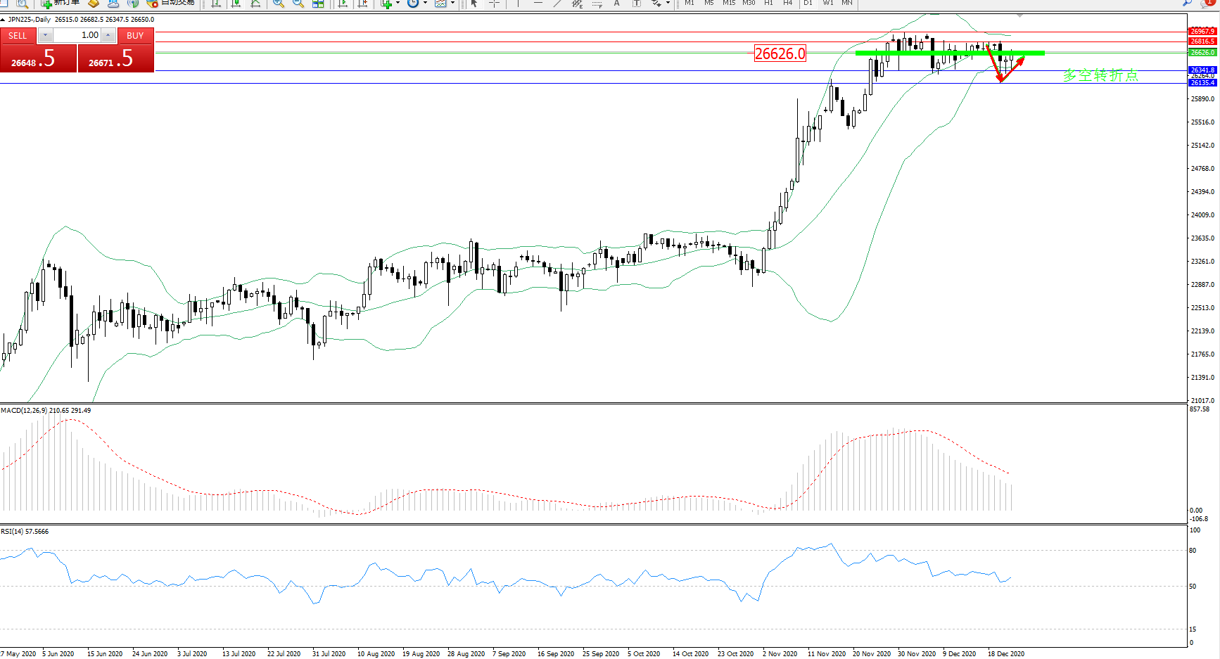 日经225指数12月23日(周三)收盘上涨80.11点,涨幅0.30%,报26516.50点。日本东京报告日新增新冠肺炎确诊病例748例。日本全球单日新增新冠感染病例创3212例的纪录新高,日本政府疫情顾问:并未在日本发现英国的新毒株。日本内阁官房长官加藤胜信:日本将加强针对英国旅客的边境管制措施。密切监测变异新冠病毒在日本出现。要求民众不要前往英国进行短期访问。日本经济再生大臣西村康稔:听闻为新冠肺炎患者提供常规医疗和护理变得越来越困难。美联储当前“零利率+无限量QE”的政策组合,对于美元指数而言是个持续的压力。